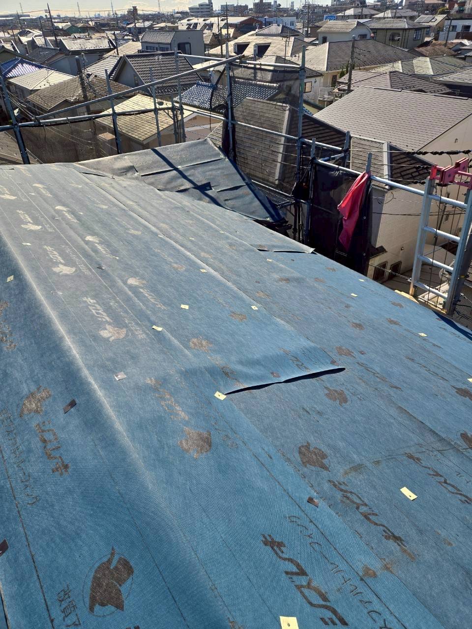 下地の状態は問題なかったため、既存のスレート材の上に防水シートを張り、その上から新しい金属屋根材を施工するカバー工法を採用しています。