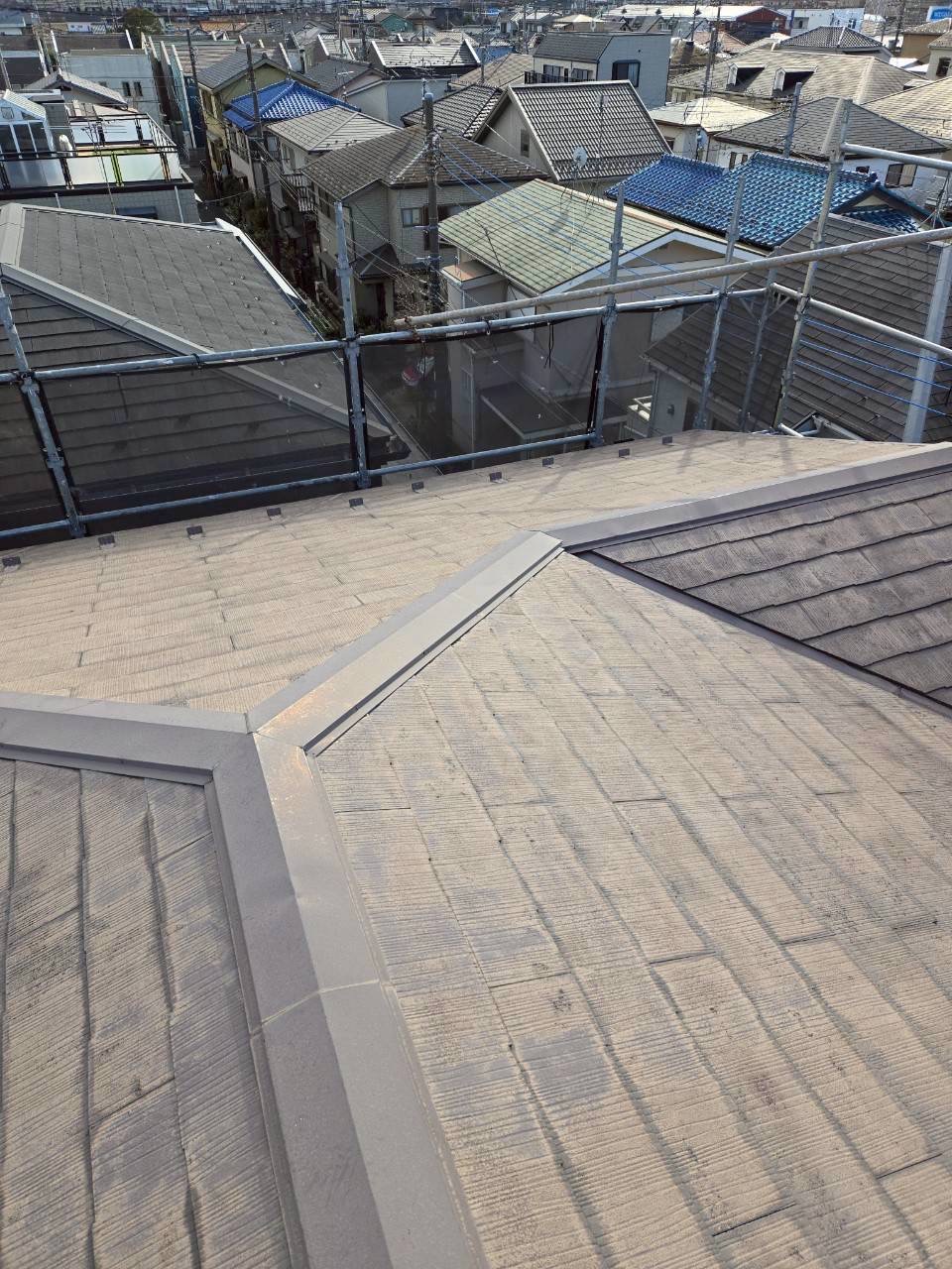 棟板金はすでに交換済みで部分的なメンテナンスは行われていましたが、屋根材そのものの防水性が落ちていたため、今回は全面的なリフレッシュをご依頼いただきました。