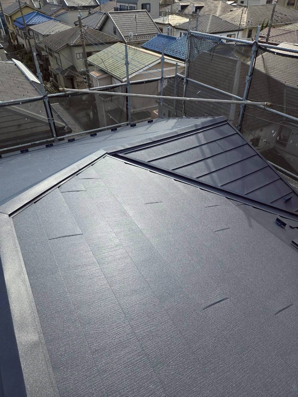 高さの違う2段構成の複合形状で、面ごとに葺き方が異なる難易度の高い現場でしたが、各面の継ぎ目・谷部もしっかり納めて仕上げています。