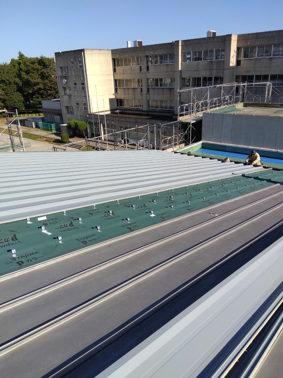 住宅と異なり施設の体育館は屋根面積が広く、工期の管理と施工中の雨養生が特に重要になる現場です。