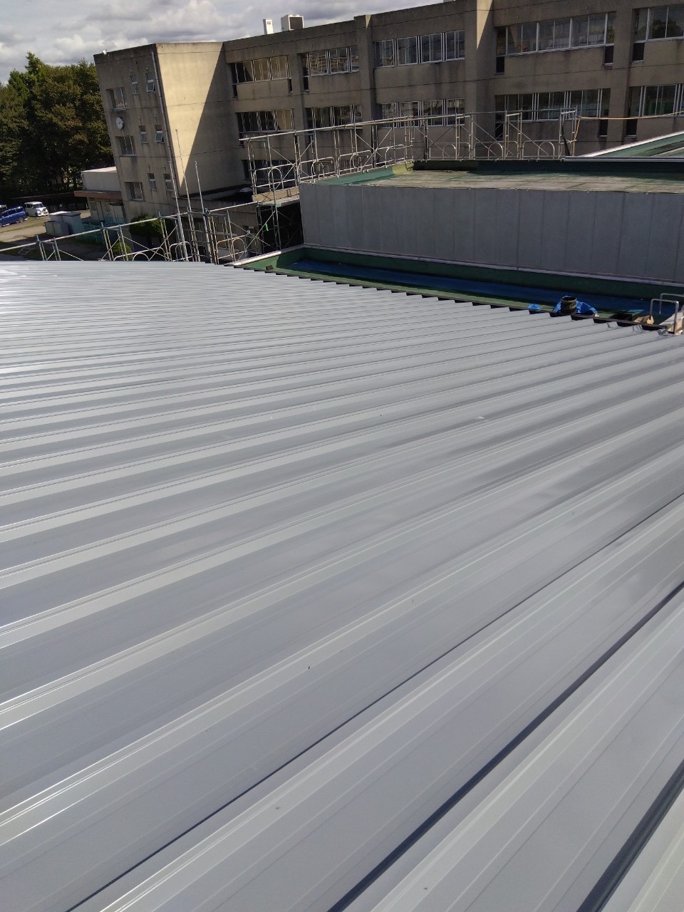 仕上がりはシルバーグレーの折板屋根で、広い屋根面全体に継ぎ目なく均一に仕上がっています。