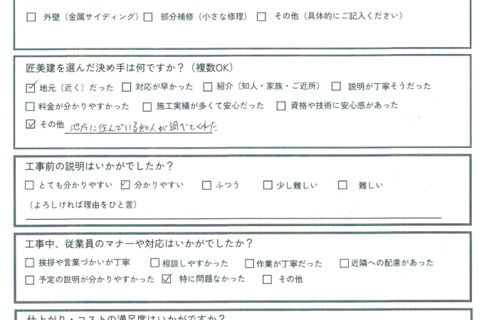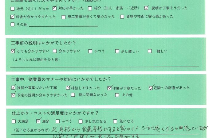 Q1. 今回のご相談内容は何ですか? 屋根の葺き替え Q2. 匠美建を選んだ決め手は何ですか? 地方に住んでる知人が調べてくれた ...
